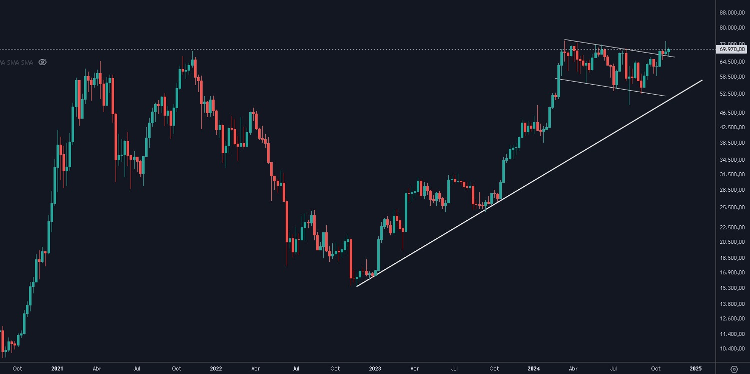 Actualmente, Bitcoin cotiza en torno a los 70,000 dólares, un nivel que no solo marca la salida de este canal de corrección, sino que abre la posibilidad de que el activo digital se dirija hacia nuevos récords históricos. La ruptura al alza de este patrón gráfico sugiere un cambio en la tendencia, lo que podría significar que los compradores han retomado el control del mercado.