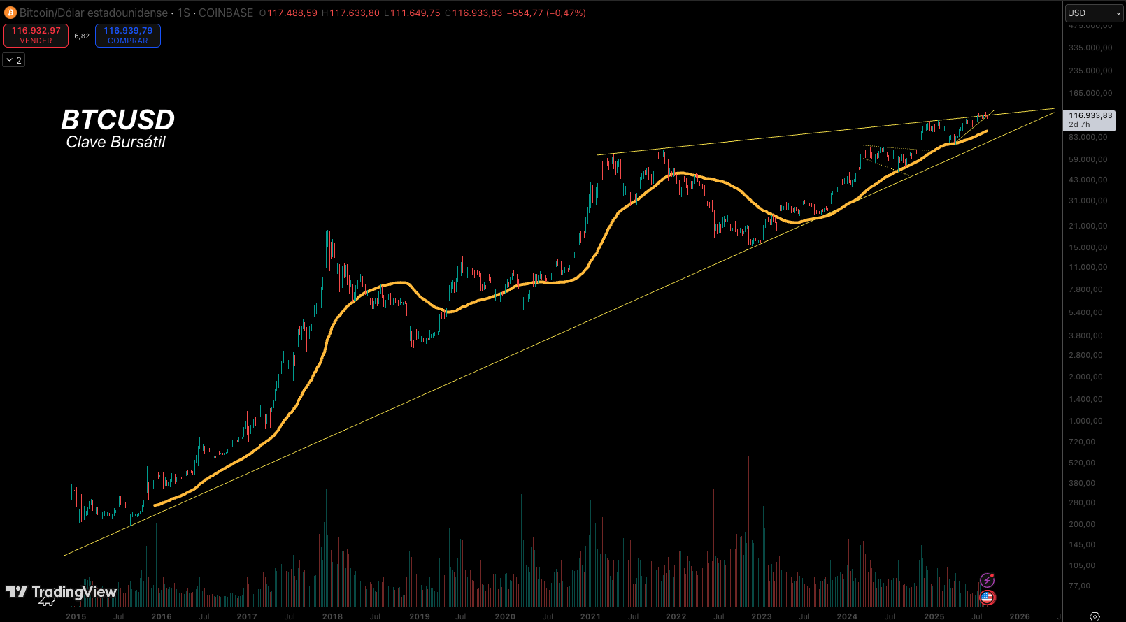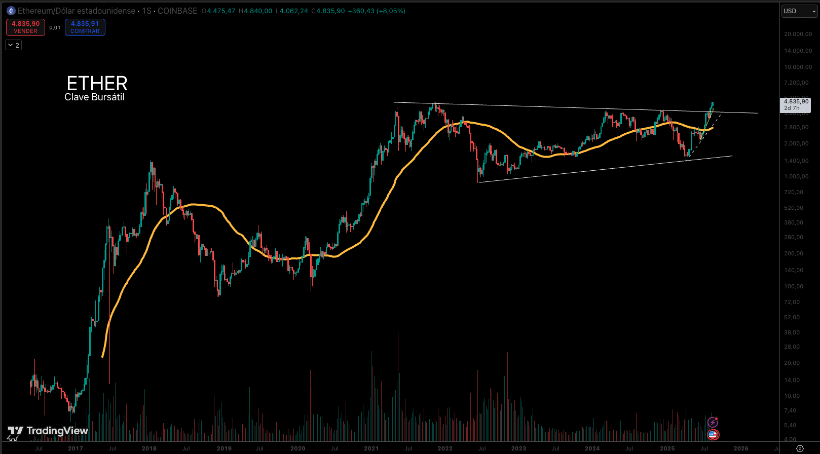 – Ethereum/Dólar (ETH/USD): El precio de ETH en Coinbase alcanzó los $4,835.90 (+8.05%), con una ruptura alcista que confirma el impulso tras el discurso de Powell. La media móvil de 50 días actúa como soporte clave.