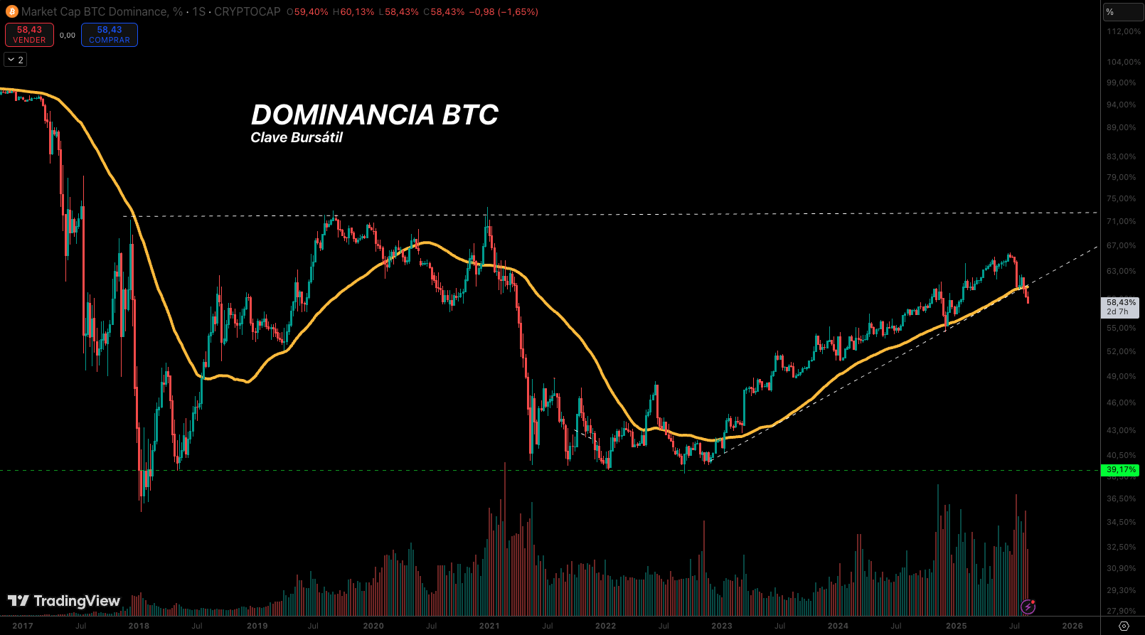 – Dominancia de Bitcoin (BTC Dominance): La tendencia bajista de largo plazo se quebró a la baja, sugiriendo una posible redistribución de la fuerza hacia las altcoins. Actualmente, el indicador se sitúa en torno al 58.43%, con una ligera caída del -0.98% en las últimas 24 horas.