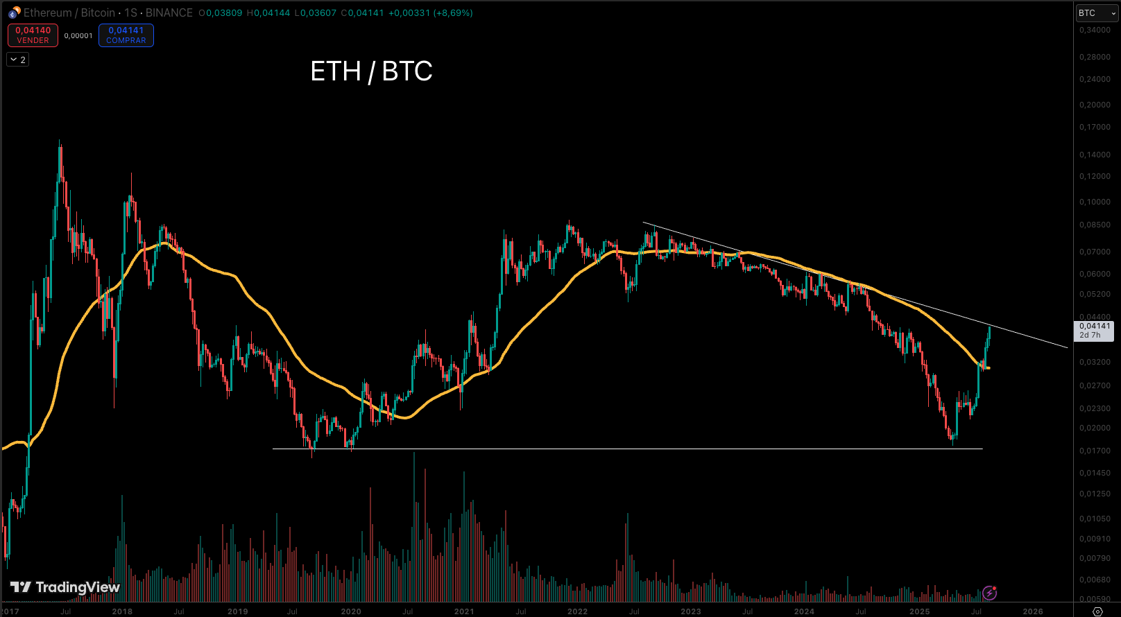 A pocos días del discurso de Jerome Powell en Jackson Hole, las criptomonedas alcanzaron nuevos máximos históricos, destacándose Bitcoin (BTC) y Ethereum (ETH). Este rally presentó una característica particular: la fortaleza relativa de BTC frente al resto del ecosistema cripto comenzó a mostrar señales de cambio. Un análisis técnico de los gráficos revela que la dominancia de Bitcoin rompió su tendencia bajista de largo plazo, al igual que el par ETH/BTC, con un desempeño notablemente más vigoroso de ETH en comparación con BTC durante este período.