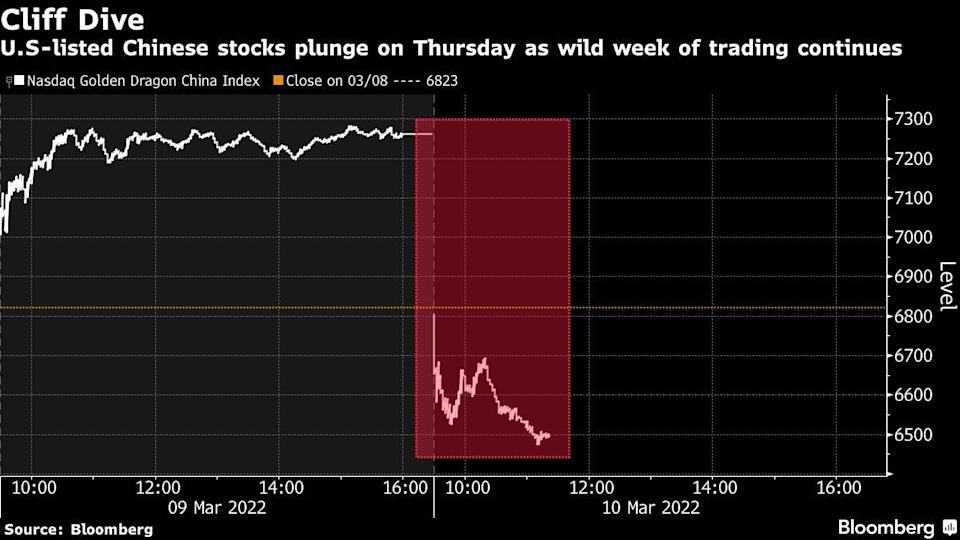 El índice Nasdaq Golden Dragon China se desplomó un 10% el jueves, dirigiéndose a su mayor caída desde octubre de 2008. Los recibos de depósito estadounidenses de megacaps como Alibaba Group Holding Ltd. y Baidu Inc. se desplomaron al menos un 6%, y las empresas de vehículos eléctricos, como Nio Inc. y XPeng Inc. cayeron más de un 9% cada una.